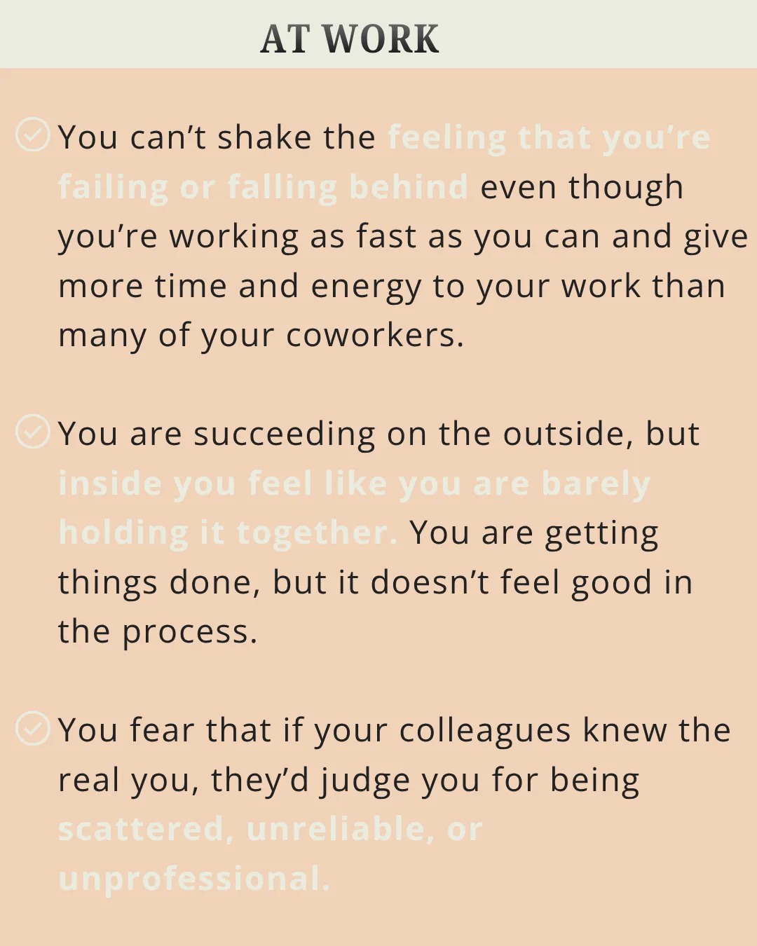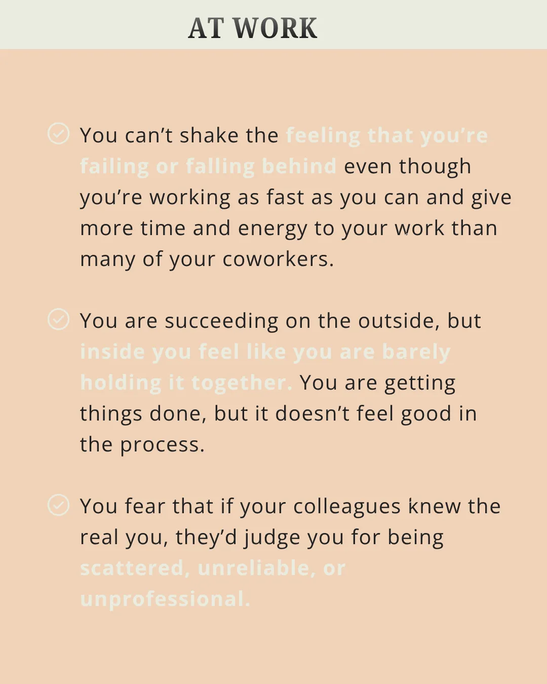 Whether you are newly diagnosed with ADHD, diagnosed and dismissed (meaning you know you have ADHD, but you feel pressure to function as though you don't) or know what you to do, but can't seem to do it, you are in the right place.